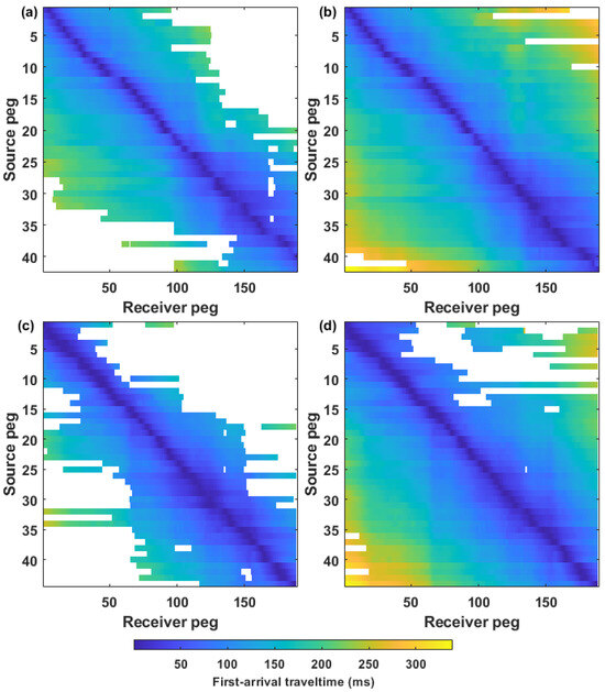 Figure 7. Traveltime pick matrices for the original and SVI-enhanced datasets. (a,c) Traveltime picks obtained from raw data for Lines 1 and 2, respectively, with noticeable gaps at far offsets due to noise contamination. (b,d) Traveltime picks from SVI-processed data showing greatly improved pick continuity and spatial coverage.