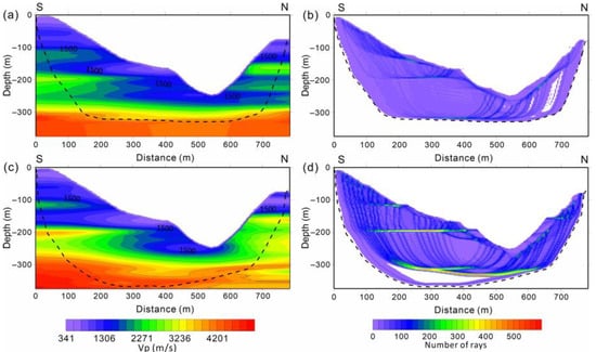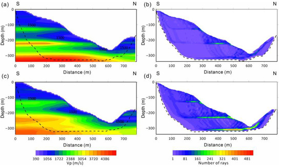 Figure 9. Line 2 first-break tomograms using traveltimes picked at (a) first arrivals from raw data without SVI processing; (c) SVI first arrivals. (bd) Corresponding raypath diagrams, respectively.