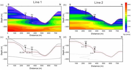 Figure 11. Lines 1 and 2 (a,b) VP geophysical models and (c,d) interpreted interfaces.
