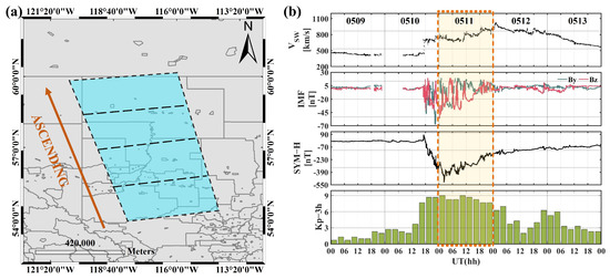 The region of interest is visually depicted in Figure 1a. This region is selected for the survey because auroras occurring at mid-latitudes are relatively rare. Another reason is that there are more engineering surveys in the mid-latitude region, and the effect of auroras on interferograms is not yet known. The Sentinel-1A VV/VH dual-polarization imaged in the Canadian region, and then four views were used for splicing, with the Dst reaching −397 nT at SAR imaging. VV polarization is co-polarization, where both transmission and reception have electric field vectors oriented in the vertical direction. Conversely, VH polarization is cross-polarization, with the transmission electric field vector oriented vertically and the reception electric field vector oriented horizontally. All images examined in this research were acquired during ascending orbits. Accompanied by a strong substorm, the AE reached 1011 nT at this time. Other corresponding geomagnetic indices are indicated in Figure 1b. The meaning of each of these data is well known and will not be repeated here.