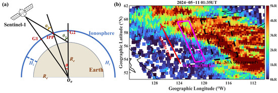 (a) Schematic diagram of IPP calculation. (b) Relative positions of SSUSI and Sentinel-1A. The dashed black rectangle shows the Sentinel-1A (S1A) ground observation area from Figure 1a. The solid magenta rectangle shows the Sentinel-1A observation area mapped onto 350 km altitude. The footpoint of satellite track is shown by the red line.
