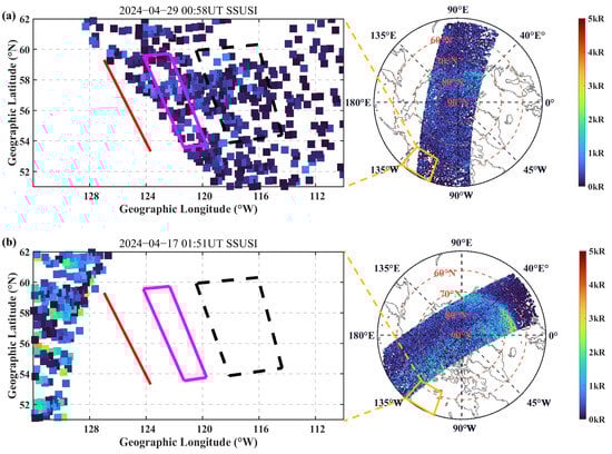 (a,b) The relative position of SSUSI to the region of interest for 29 April 2024 and 17 April 2024, respectively. Detailed description of the images can be found in Figure 5.