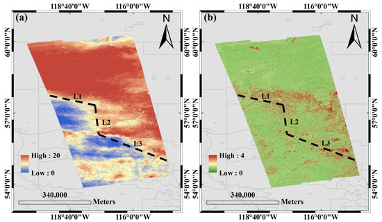 As illustrated in Figure 3a, there is a noticeable increase in phase values in the northeastern section of the interferograms (approximately above 58°N and east of 57°N), exceeding 20 radians. As can be seen from Equation (1), this represents a of approximately more than 6 TECU between the master and slave images. In contrast, the phase values on the southwestern side of the interferograms are notably lower than those in the northern region. The figure clearly marks a distinct boundary line. By excluding the influence of other factors, it becomes apparent that a specific local TEC enhancement exists within the area of phase increase, likely instigated by the interaction with aurora phenomena during SAR imaging. Figure 3b depicts a similar scenario to Figure 3a, with both demonstrating localized enhancements in the northeastern portion of the image. While there are minor discrepancies, these are likely due to variations in the slave images used. To simplify the delineation of suspected auroral boundaries, the figure labels the L1, L2, and L3 structures with black dashed lines. These lines do not represent the actual boundaries of the aurora borealis but are primarily meant as reference points for the subsequent discussion. The genuine boundaries of the aurora borealis are intricately detailed within the interferogram.