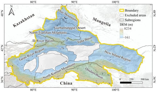 Based on China’s secondary basin classification system [], the study area was subdivided into 11 hydrological subregions (Figure 1). The Taklimakan Desert and Tarim Basin were excluded due to negligible snowfall contributions. Nine analyzed subregions comprise: Altai Mountains (ATM), Qaidam Basin (QDB), Gurbantunggut Desert (GTD), Hexi Inland Region (HIR), North Kunlun Mountains (NKM), Tarim River Region (TRR), North Tianshan Mountains (NTM), Tuha Basin (THB), and Ili River Basin (IRB). The delineation of the study area explicitly incorporates mountain subsystems of the Qilian, Altai, Tianshan, and Kunlun ranges, as these orographic features constitute the predominant source of the region’s water resources through seasonal snow accumulation and melt processes.