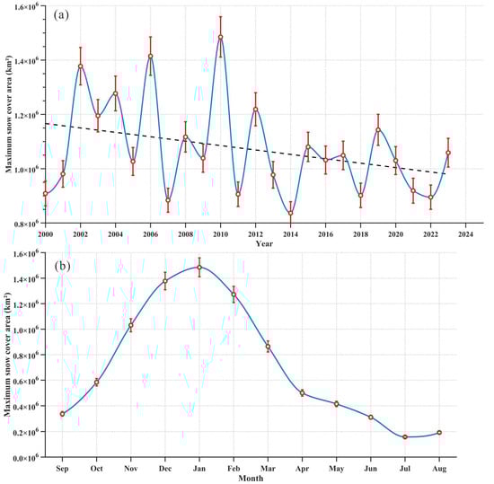 Interannual variations in the maximum SCA (a) and monthly SCA (b) in arid northwest China from 2000 to 2023 (The blue solid line represents the changing trend of SCA, and the black dashed line represents the linear fitting curve).