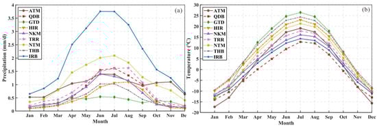 Arid northwest China spans 73°E–107°E and 35°N–50°N, encompassing the Xinjiang, Hexi Corridors, and Qaidam Basin across a total area of 2.35 × 10⁶ km2. This region exhibits extreme topographic contrasts, with elevations ranging from the world’s highest peaks (>8000 m) in mountain ranges to −161 m, one of Earth’s lowest inland basins. Characterized by a hyper-arid climate, annual precipitation averages < 200 mm due to its continental interior position and orographic barriers posed by surrounding mountains, including the Altai, Tianshan, Kunlun, and Qilian ranges []. These unique geographic and topographic conditions create a climate-sensitive hotspot for studying cryospheric atmospheric interactions.
