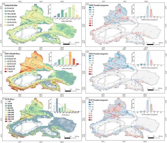 SP displayed marked spatial heterogeneity, with northern mountain systems characterized by earlier SOD, delayed SED, and consequently prolonged SCD relative to southern lowlands. Interannual analysis demonstrated increasing SCD durations in northern mountainous areas concurrent with advancing SOD. This shift in the SOD may be attributed to alterations in precipitation patterns associated with regional warming [].