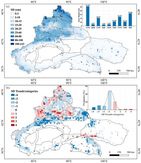 The spatial distribution of SD in arid northwest China during 2000–2023 revealed a pronounced latitudinal gradient, with maximum values in northern mountainous zones and minimum values in southern zones (Figure 6a). Northern zones exhibited extreme SD magnitudes up to 143 cm, contrasting sharply with southern regions where SD remained ≤10 cm. Subregional analysis identified moderate SD ranges (20–60 cm) in the ATM, NTM, and GTD. The northern ATM sector maintained exceptional snow accumulation (>100 cm mean SD), while the southwestern QDB and HIR recorded minimal values of 4.4 cm and 3.6 cm, respectively.