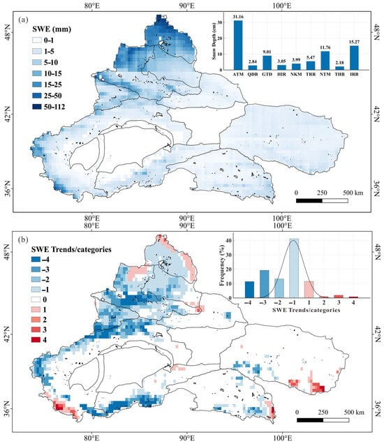 Spatial distribution of SWE (a), and the spatial distribution trend categories and frequency (b) from 2000 to 2020 in arid northwest China.