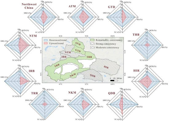 Overall, about 55.56% of the study area showed a decline in snow cover, with strong consistency among all snow indicators in most subregions, except for the QDB. Significant reductions in SD and SCD were observed in the TRR and THB, while extensive SWE loss occurred in the NTM and IRB. These changes are largely driven by rising temperatures and reduced snowfall.