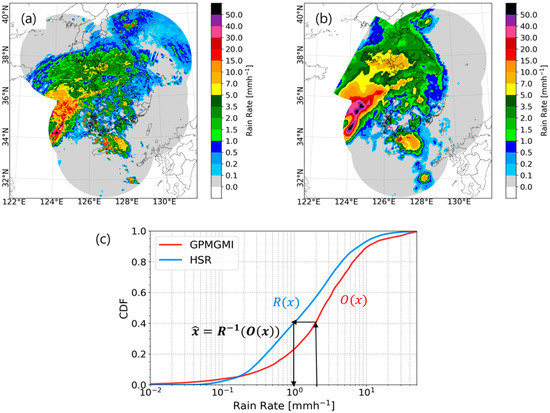 Figure 3a and Figure 3b show sample precipitation images from ground-based radar and GPM GMI data, respectively, at 16:40 UTC on 10 September 2017, spatially aligned after interpolation. Figure 3c illustrates the cumulative density function (CDF) derived from the ground-based radar precipitation data (denoted as ‘R’) and the GPM GMI precipitation data (denoted as ‘O’) at this specific time.