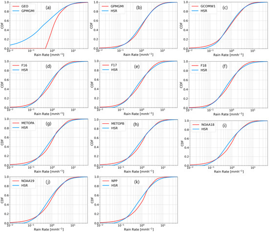 CDFs for adjustment according to each satellite’s rain rate. The blue line represents reference data, and the red line represents the satellite. (a) GEO, (b) GPM GMI, (c) GCOMW1 ASMR2, (d) DMSP F16 SSMIS, (e) DMSP F17 SSMIS, (f) DMSP F18 SSMIS, (g) METOP-A MHS, (h) METOP-B MHS, (i) NOAA-18 MHS, (j) NOAA-19 MHS, (k) SNPP ATMS.