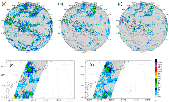Sample images of 10 September 2017 at 18:00 UTC: (a) Himawari-8 (GEO) rain rate, (b) ground-based radar precipitation rate derived from reflectivity, (c) GTS gauge precipitation rate, (d) GCOM-W1 (LEO) surface precipitation rate, and (e) IMERG Final calibrated precipitation.