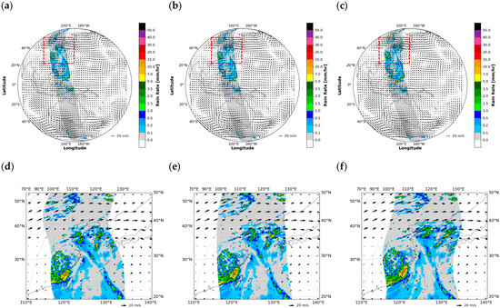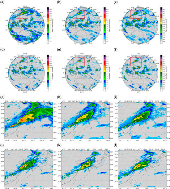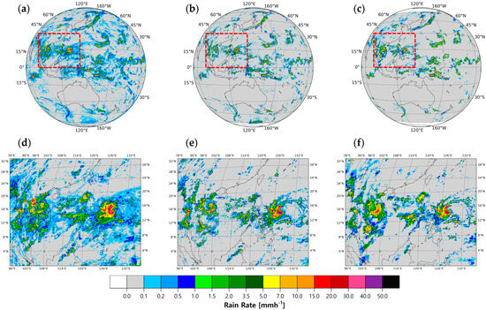Rain rate distribution on 25 July 2017 at 16:00 UTC from three satellite-based precipitation datasets: (a,d) the Late version merged product developed in this study, (b,e) IMERG-F, and (c,f) GSMaP. Panels (a–c) show a global view centered on the western Pacific, and red boxes indicate the zoomed-in regions shown in (d–f).