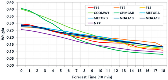 This computation was also applied to the precipitation forecast field to determine the corresponding weights for each forecast time.