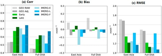 Comparison of GTS-based errors of seven satellite precipitations by precipitation merging methods: (a) correlation coefficients (Corr), (b) bias, and (c) root mean square error (RMSE).