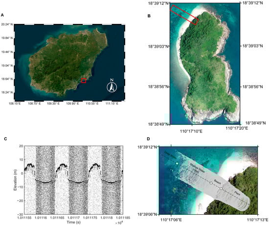The experimental data utilized in this study were acquired from coastal zone measurements over a reef island. A drone-borne lightweight single-photon-counting LiDAR survey was conducted on 8 August 2020 at 10:00 A.M. local time near Jiajing Island (coordinates: 110°17′24″E, 18°00′N), located south of Shimei Bay in Wanning City, Hainan Province, China. The survey area is illustrated in Figure 1. Jiajing Island is a reef island ecosystem characterized by diverse coastal interfaces, including wave-modulated seawater, rough sandy beaches, and dense vegetation areas. This area was specifically selected to represent the dynamic land–sea transition, where the coupling of bidirectional reflection effects and solar noise is most prominent. This provides an ideal test-bed for validating the adaptability of the BNR-B model to complex coastal environments. The drone platform, equipped with a LiDAR system, performed comprehensive measurements of the terrain and generated complete point cloud data. During the experiment, the drone maintained an average flight altitude of 120 m and a flight speed of 2 m/s. Most survey lines followed contour-perpendicular directions, extending outward from the island interior, covering diverse surface media including seawater, sandy beaches, vegetation, and rocky substrates.