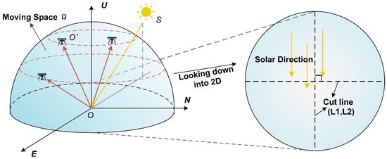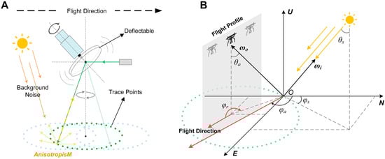 As shown in Figure 2B, taking the measurement point  as the origin, an NEU (north–east–up) coordinate system  is established. Suppose a platform equipped with a laser performs measurement operations at a certain flight altitude along the heading  at a certain time . The latitude and longitude of the measurement area are approximately  and . Since the distance between the sun and the earth is much greater than the measurement distance, on the premise that the measurement range does not change significantly, the azimuth and zenith angle of the sun can be approximately regarded as constants. Taking advantage of the stability of celestial motion, Reda et al. derived a set of models []. By providing only the observation position and observation time, the azimuth  and zenith angle  of the sun can be calculated (with an accuracy of ±0.0003°). Therefore, when the measurement position and time are known, the sun direction vector  can be approximately expressed as