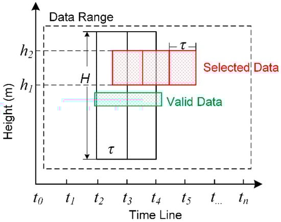In contrast, the calculation of the statistical noise rate represents the result of the actual measurement data, and the calculation process is more straightforward and intuitive. The statistical noise rate obtained from actual measurements is usually defined as a quantity directly related to the number of noise points within a certain area. As shown in Figure 3, in the time–elevation distribution diagram, assuming that the data have a certain time span, by marking the time scales , , , …,  at equal intervals with a time interval of , multiple groups of rectangles can be obtained, and each rectangular window can be regarded as one frame. In the elevation direction, the area where the data are distributed is generally called the height window, denoted as H. Within the entire height range, except for some valid data existing on the ground surface, the rest are purely background noise data, and the distribution in the vertical direction is often relatively uniform. Therefore, when calculating the statistical noise rate, in order to ensure that all the data involved in the statistics are noise data, a certain height range, such as , is usually intercepted, and then the noise data within this range are used to represent the noise data of the entire height range in an equal-proportion manner. Therefore, for a certain moment , its statistical noise rate becomes the number of data points within the rectangular window corresponding to . The specific relationship can be written as