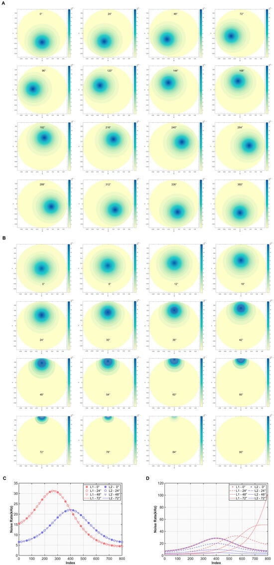 Figure 5A illustrates the spatial distribution characteristics of the noise rate calculated by the BNR-B model under different solar azimuth angles. In the experiment, the solar zenith angle was fixed at 20°, and the solar azimuth angle was sampled in all circumferential directions (from 0° to 360°) at intervals of 24°. The color in the figure is mapped to the intensity of the noise rate, and the X-Y coordinates represent the projection components of the laser receiving direction in the hemispherical coordinate system. The results show that the change in the solar azimuth angle only leads to the rigid rotation of the noise distribution pattern, while the numerical magnitude and the distribution morphology are exactly the same, verifying the rotational symmetry of the model in the horizontal plane. This characteristic indicates that the calculation results of any azimuth can be mapped to the reference azimuth (such as 0°) through a rotation transformation, and the model itself is not substantially affected by the change in the azimuth angle.