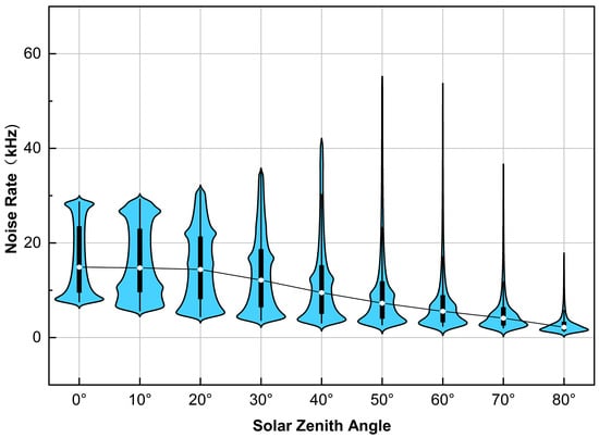 To further analyze the impact of the zenith angle on the noise rate distribution, the violin plots in Figure 6 statistically quantify the dependence of the noise rate on the zenith angle across the entire hemispherical field (zenith angles from 0° to 80°). The results show the following: (1) Affected by the weakening of the specular reflection intensity, the median noise rate (black curve) continuously decreases as the zenith angle increases. It is fitted according to the Gaussian formula as  ( = zenith angle); . (2) As the zenith angle increases, the noise rates concentrate within a narrower range (the interquartile range is reduced by 68%), and the long tails indicate the existence of residual specular reflection hotspots. (3) When the zenith angle is greater than 60°, the spatial heterogeneity decreases, indicating the emergence of a quasi-uniform noise field, in which the noise levels in most directions are similar. This also means that the zenith angle determines the trade-off between noise intensity and directional uniformity. At low zenith angles (the sun is close to the zenith), high-intensity noise concentrates in the specular reflection region, which requires trajectory planning to avoid critical angles. At high zenith angles (the sun is close to the horizon), the uniform low-intensity noise simplifies the system calibration process, but it requires higher detector sensitivity.
