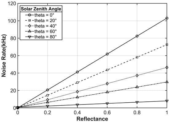 Figure 7 shows the linear relationship between the noise rate and the surface reflectance (ranging from 0 to 1) under five solar zenith angles (0°, 20°, 40°, 60°, 80°). To eliminate the directional bias and isolate the effect of reflectance, the noise rate for each configuration is represented by the hemispherical field-averaged value. As shown in the figure, all curves exhibit a linear increase with an increase in reflectance ( > 0.99), which confirms that the reflectance is a major limiting factor of the background noise. The magnitudes of the slopes (103.00, 72.66, 46.46, 29.75, and 8.05 for the five solar zenith angles from 0° to 80°, respectively) decay exponentially with the increase in the zenith angle. The equation can be derived as  ( = zenith angle); . This trend is consistent with the specular reflection-dominated energy redistribution; that is, smaller zenith angles enhance the sensitivity to reflectance by distributing photons over a wider angular range. However, when the zenith angle is 80°, the slope drops to 7.8% of that when the zenith angle is 0°, which reflects that the energy is severely restricted near the specular reflection direction. Therefore, under grazing illumination conditions, the change in reflectance has a minimal impact on the overall noise rate. In addition, the stable linear relationship (residual standard deviation ) enables the direct implementation of reflectance normalization in the noise correction process, especially applicable to nadir observations or cases with small zenith angles.