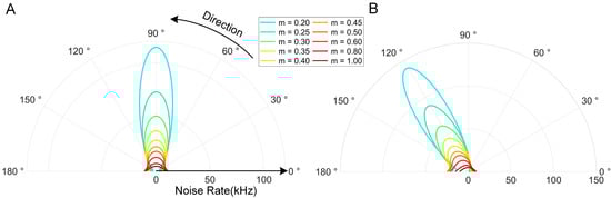 To more intuitively observe the influence of different medium roughnesses, we selected 10 groups of roughness values within the range of 0–1 for calculation, basically covering common media such as water surfaces, sand, and land surfaces. The solar light source is placed at zenith angles of 0° and 30°, with “m” representing different roughness levels. The results are shown in Figure 8A,B. Considering that the change in the solar azimuth angle mentioned in Section 3.1.1 does not cause numerical differences, the solar azimuth angle is selected as 0° here. That is, the cross-section studied in this experiment is the plane where the solar azimuth angles of 0° and 180° are located. It can be seen from the figure that the change in the solar zenith angle does not affect the law dominated by specular reflection; that is, the energy mainly concentrates near the mirror image direction. As the solar zenith angle moves, the direction of the model result also changes accordingly. It is worth noting that this directivity is greatly weakened after the roughness exceeds a certain level. The roughness regulates the scattering direction of the micro-surfaces through the normal distribution function (NDF). When the roughness increases from 0 (specular surface) to 1 (diffuse surface), the energy is dispersed from the specular direction to a wider angular range, resulting in a decrease in the spatial heterogeneity of the noise field. Taking Figure 8A as an example, as the roughness increases, the influence of the micro-surfaces parallel to the medium plane on the distribution function gradually decreases, and more energy is radiated and dispersed to a larger area outside the vertical plane. So, intuitively, the model result seems to contract inward in a concentric structure. However, it can actually be seen that this contraction law will change to outward expansion when the laser zenith angle exceeds 84 degrees. This is because under the current model assumptions, the model result is determined by multiple parameters, especially the parameter term in the denominator related to the angle between the laser receiving direction and the normal direction. When the laser zenith angle is large, this angle is close to 90 degrees, and its cosine value is close to 0, which leads to a certain tendency for the model result to extend outward when the laser zenith angle is large. But obviously, this belongs to the internal characteristics of the model itself and does not affect the overall regular results. In Figure 8B, when the position of the sun is at the marked position of 60 degrees, the energy is mainly concentrated near the mirror image direction of 120 degrees, and the peak direction is 120 degrees. This also indicates that significant instantaneous high-intensity noise will be generated when the receiving direction of the laser coincides with the reflection direction of the sunlight. For example, when the roughness is at a relatively small value of 0.2, the noise rate can reach up to 142 kHz. It is worth noting that in an absolutely ideal situation, all the energy should be radiated in the form of forward scattering. However, due to the increase in roughness, while the overall result contracts inward, the center of gravity of scattering also shifts, manifested as a gradual weakening of forward scattering and a gradual strengthening of backward scattering. This means that under the dominance of roughness, completely different scattering characteristics can be obtained, which is also an important influencing factor in the model.