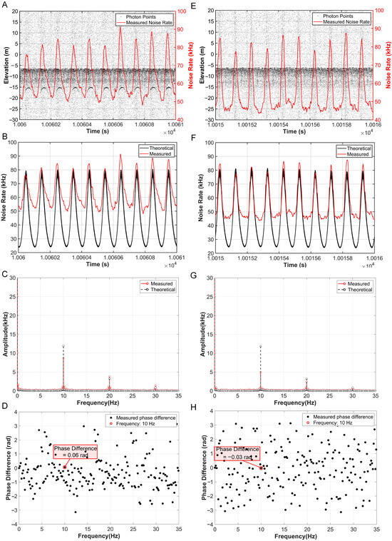 To verify the model, the theoretical noise rate (black curve) was compared with the measured results (red curve) (Figure 9B,F). It can be intuitively observed that the two are highly consistent in trend and magnitude. Since the measured laser has a periodic scanning characteristic, the periodicity of the measurement results is also consistent with its rotation speed of 10 r/s; that is, the rotation frequency is 10 Hz. Therefore, with the help of frequency-domain analysis, the spectral consistency and phase coherence between the two can be further quantified and revealed. As can be seen from Figure 9C,G, both the theoretical and measured values exhibit significant energy peaks at 10 Hz, confirming the noise modulation mechanism dominated by the scanning period. In the phase diagrams (Figure 9D,H) reflecting the time correlation, the phase differences corresponding to the 10 Hz components are 0.06 rad and −0.03 rad, respectively, indicating that there is almost no time deviation in the main 10 Hz components of the two groups of data. The model accurately captures the time-series characteristics of direction-dependent noise. It can be seen from this that the BNR-B noise model constructed in this study successfully replicates the periodic fluctuations of the noise rate caused by the dynamic coupling of the laser–sun geometry (the relative phase error < 2%). This demonstrates its ability to characterize direction-sensitive noise under complex optical path conditions, providing a theoretical tool for the real-time noise correction of airborne single-photon LiDAR.