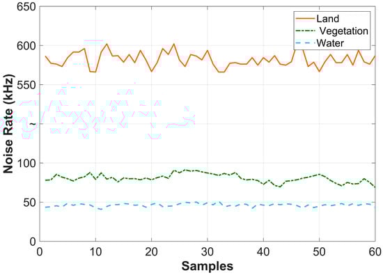 As can be seen from Table 1, the measured noise rate of the land (beach) is the largest, with an average value reaching 582.12 kHz. This is followed by the measured noise rate of the vegetation, and the smallest is the noise rate of the water body, with an average value of only 46.7 kHz. Among them, the coefficient of variation of the vegetation is the largest, which means that the noise rate of the vegetation is the most unstable. This is because the types of vegetation and the shapes of the leaves scanned within a certain period of time may be different, resulting in differences in the noise rate results. The coefficient of variation of the beach is the smallest, because the beach, scanned within a short period of time, does not change much. And changes in the water body may be related to water surface fluctuations caused by the wind and waves.