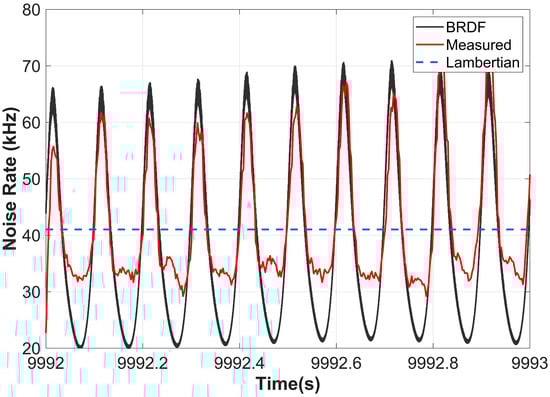 It can be clearly seen from the figure that the noise rate calculated based on the BRDF model is more consistent with the variation in the measured data. The BRDF model accurately reproduces the dynamic fluctuation characteristics of the measured noise rate. The RMSE of its first-order difference is 6.61 kHz, which is significantly better than the 9.26 kHz of the Lambertian model, with an accuracy improvement of 28.6%. This model can significantly reflect the influence of the laser direction on the noise rate result, which fully demonstrates that the background noise model based on BRDF has stronger adaptability and can better cope with various orbital inclination situations. With this excellent adaptability, the model can provide more accurate guidance for measurement work and effectively reduce the adverse impact of noise on data quality.