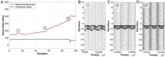 In order to provide more room for analysis in subsequent research, we have selected rich data from different ground object scenarios. The more intuitive range of the measured data is shown in Figure 1D. The data points in the figure are obtained by using appropriate methods to remove the noise points from each data file []. This data strip extends from the densely vegetated land area towards the ocean. The measured data of different ground objects (such as deep water, shallow water, sandy beaches, and vegetation) correspond to different data densities. This is also because the signal-to-noise ratio is affected by the noise. In general, the causes of these phenomena need to be further studied and explained. How to systematically establish the relationship between parameters such as the measurement environment and the system environment and the noise rate, and accurately evaluate the noise rate level, is an important issue that needs to be addressed at present.