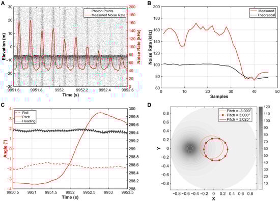 (A) Schematic diagram of the measured noise rate and the point cloud data. (B) Schematic diagram of the measured and theoretical noise rates. (C) Diagram of attitude changes within different time periods. (D) Schematic diagram of the scanning results in the noise field under different pitch-angle conditions.