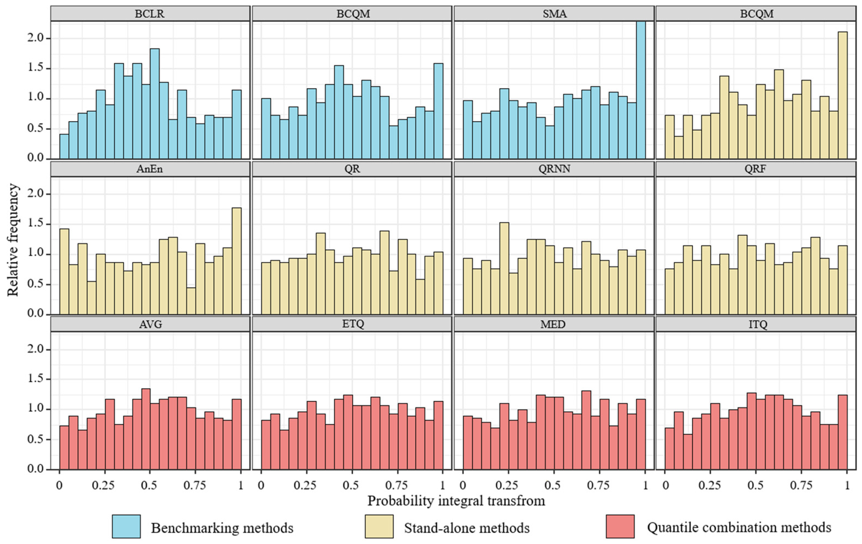 | Quantile combination | AVG | The final quantile for event t is obtained by averaging the quantiles produced by the 5 stand-alone site adaptation methods. | Simple to understand and achieve. | May be affected by extreme values, causing predicted results to deviate from the actual values. | Non-parametric |