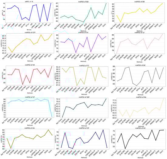 The average detection accuracy on the DOTA-v1.0 dataset. Each point represents the AP50 value of a specific object category for the corresponding model. The horizontal axis lists the compared models and the vertical axis indicates the per-category detection accuracy.