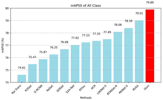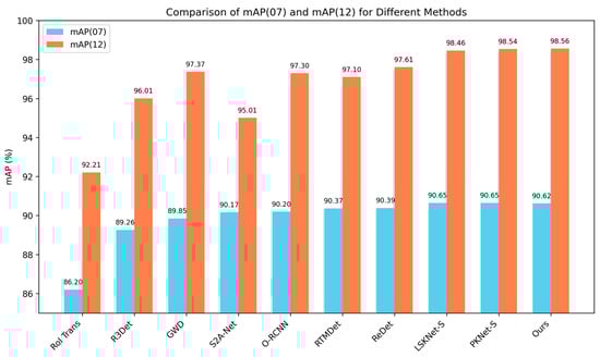 Results for HRSC2016: The ship instances in HRSC2016 exhibit significant variations in the aspect ratio, arbitrary orientation, and instance size within the same category, posing a great challenge to the detector’s generalization and accuracy. We evaluate the performance of LS-MambaNet on the HRSC2016 dataset against nine state-of-the-art methods. As shown in Table 3, the mAP values under PASCAL VOC 2007 and VOC 2012 metrics are 90.62% and 98.46%, respectively. This demonstrates that, compared to other methods, LS-MambaNet has stronger robustness in recognizing objects with large scale variations. Figure 7 shows the bar charts of the mAP (07) and mAP (12) metrics for the comparison methods on the HRSC2016 dataset.