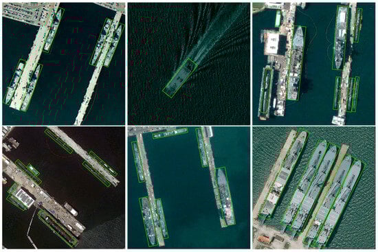 HRSC2016 [] is a high-resolution remote sensing dataset that is collected for ship detection. It consists of 1061 images: 436 images are for training data, 444 images are for testing data, and the rest are validation data. It contains 2976 ship instances.