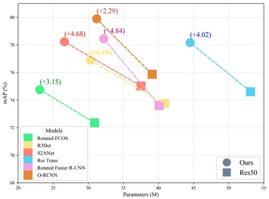 Compared to various remote sensing detectors [,,,,,], our method achieves reliable performance improvements in DOTA with fewer parameters.