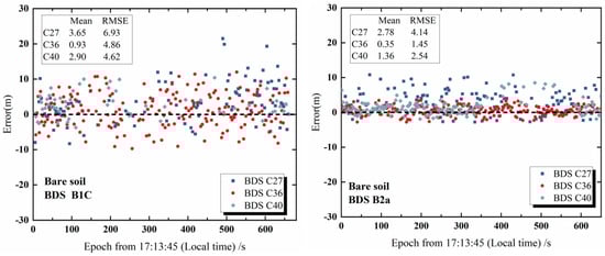 Figure 6 and Figure 7 show the results recorded over the bare soil. The overall accuracies ranged from 1 to 3 m. With the exception of BDS C39 and B1C, all signals were continuous. It should be noted here that the elevation angle range of the BDS C39 satellite was from 79° to 80° and that of the GPS G26 satellite was from 58° to 54°. The accuracy of the solutions resolved from the GPS C/A signal was the worst, followed by those derived from BDS B1C. BDS B2a and GPS L5 demonstrated the best performances and had comparable accuracies. As the code rates of BDS B2a and GPS L5 were ten times those of BDS B1C and GPS C/A, these results indicated that solutions with higher accuracy could be achieved by using signals with higher code rates. As B1C signals are modulated using more advanced modulation methods, their inversion accuracies were also higher than those of the C/A codes. BDS B2a and GPS L5 use similar modulation methods and the same code rate; thus, their retrieval results had similar accuracies. However, the overall accuracies of the solutions obtained were higher for incoherent cumulative count values of 10 and 25 in most cases, whereas the accuracies tended to deteriorate for incoherent cumulative counts of 2 and 100. As the reflected signals from land are much weaker than those reflected from a water surface, multiple incoherent accumulations are necessary and can enhance the signal-to-noise ratio to allow effective waveforms to be obtained. However, longer incoherent integration times contain more clutter, which affects the ranging accuracy. Shorter incoherent integration times affected the reliability of the observations. In addition, for the case where there were only two incoherent integrals, the numbers of effective observations were significantly reduced.