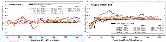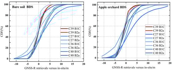 Figure 17 shows the cumulative probability density of drone height differences between the GNSS-R retrievals and the corresponding GNSS RTK observations for different terrains and GNSS signals. Overall, the accuracy of the solutions for bare soil was slightly better than that for the apple orchard, and the observations with high elevations had better performance.