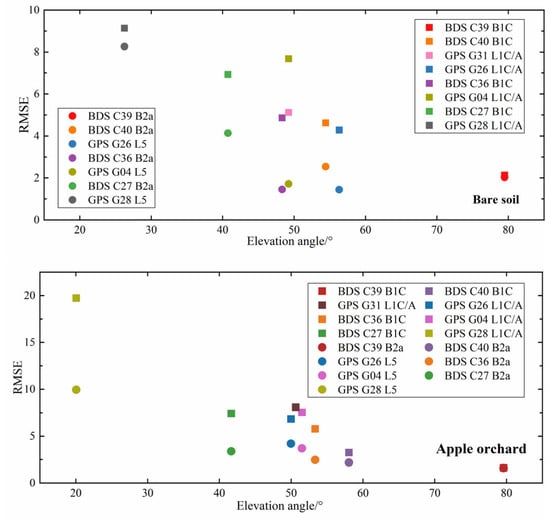 The accuracies of the solutions derived from the signals transmitted from the GNSS satellites with high elevations were higher, especially for the reflecting surface with greater roughness. In our studies, the accuracies of the solutions derived from BDS C39 over bare soil land and an apple orchard were similar, while the accuracies of the solutions derived from GPS G26 over bare soil land and an apple orchard were quite different.