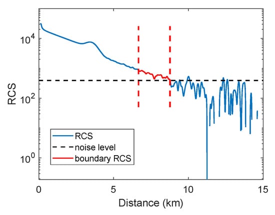 The simulated photon signals are preprocessed for denoising and range corrected in step 1, and the valid RCS is extracted as described in step 2 in Section 2. The simulated valid RCS is presented in Figure 4. The blue solid line represents the RCS and the black dashed line represents the noise level, with valid RCS signals lying above this threshold. The red solid line between the red vertical lines indicates the RCS signal used to calculate the boundary value.