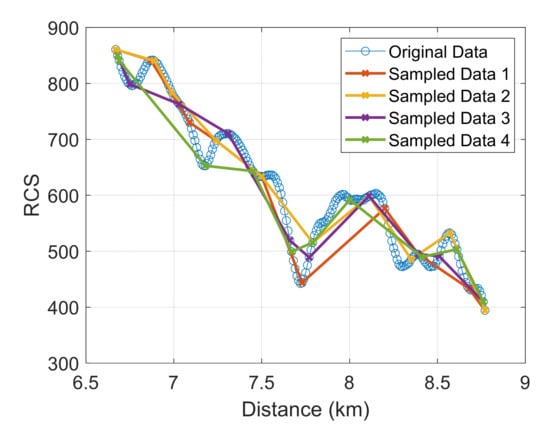 As described in step 3 in Section 2, we randomly selected 10 sample points from the valid RCS within the pre-specified range to generate a set of down-sampled data. This process was repeated to obtain 20 different sets of down-sampled data. We only present 4 out of the 20 sets of down-sampled data, as shown in Figure 5. The line with circles represents the original RCS, while the line with stars represents the selected down-sampled data.
