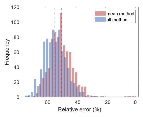 Each of the 20 sets of down-sampled data was fitted separately, resulting in 20 extinction coefficients. The range of the 20 down-sampled extinction coefficients was from 0.134 km−1 to 0.170 km−1. The mean of the down-sampled extinction coefficients was 0.152 km−1, with a relative error of −23.9%. The extinction coefficient obtained by fitting the original RCS was 0.142 km−1, with a relative error of −29.1%. The new algorithm achieved a 5.2% improvement in the accuracy of the extinction coefficient compared to the traditional method. To evaluate the method’s validity and robustness, we conducted 1000 Monte Carlo simulations with randomized signals. Figure 6 shows that the mean method produced more accurate boundary values in 794 cases (79.4% of the total simulations). Statistically, the accuracy of the mean method was 4.4% higher than that of the traditional overall method.