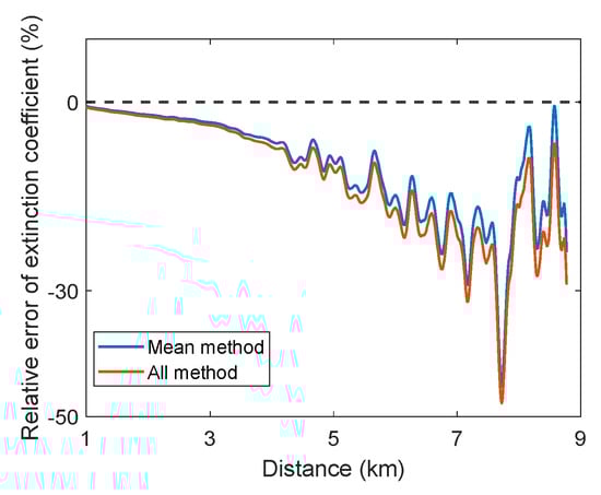 The propagation of the relative error of the extinction coefficients for the simulated signal is shown in Figure 7. The blue solid line represents the relative error of the boundary value based on the new algorithm, while the red solid line represents the relative error of the boundary value based on the direct fitting RCS. At the far end of the valid RCS, the relative error of the boundary value using the new algorithm is −23.8%, which is 5.2% more accurate than the direct fitting all-sample method (−29.3%).