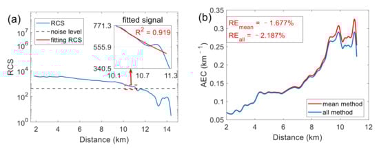As mentioned in Section 2.1, the extinction coefficient obtained from the low SNR RCS does not accurately represent the atmospheric extinction coefficient. We proposed averaging the extinction coefficients . The mean represents the aerosol extinction coefficient of the local atmosphere. Substitute as the boundary value into the Fernald backward solution to obtain the extinction coefficient profile [18].