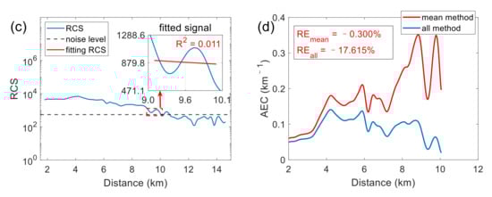 Figure 8c,d are similar to Figure 8a,b but correspond to an inhomogeneous atmosphere (R2 = 0.011) at 09:54 on 11 April 2023. At the 10.05 km boundary position, the extinction coefficients from the two methods differ significantly, measuring 0.0195 km−¹ and 0.196 km−¹, respectively. The relative errors are −0.30% for the mean method versus −17.6% for the all-sample method, indicating a 17.3% improvement in accuracy achieved by the mean method under inhomogeneous atmospheric conditions.