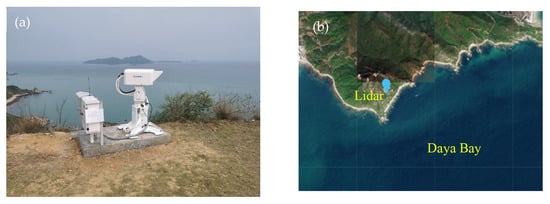 To verify the validity of the proposed algorithm, a series of continuous experiments were conducted from April 2023 to February 2024 at Shenzhen’s Marine Meteorological Observatory (22.48°N, 114.56°E). A scanning single-wavelength elastic lidar was employed to observe the horizontal optical properties of the aerosols. The lidar was installed 160 m away from the coast, allowing observation of the aerosols on the ocean surface. A photograph of the lidar is shown in Figure 9a, and the surrounding environment is shown in Figure 9b. A PWD forward scatter sensor was also installed in the observatory to provide visibility information.