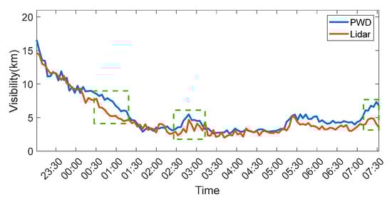 We validated the performance of the proposed algorithm using a field experiment during a sea fog event from 10 to 11 April 2023. The spatial distribution of the extinction coefficients is shown in Figure 10a,f. The figure indicates that the detection range of the lidar was approximately 12 km before the occurrence of sea fog, and around 4 km at the peak of the fog. During the sea fog, the detection range of the lidar was significantly reduced. During the sea fog, the spatial distribution of the extinction coefficient was highly irregular. The boundary value estimation method based on the new algorithm can maximize the detection range of lidar within the effective RCS and is not constrained by atmospheric homogeneity. A visibility comparison experiment confirmed that the proposed mean algorithm demonstrated high accuracy in terms of visibility observation. As shown in Figure 11, during the sea fog, the PWD (blue line) and lidar (red line) results generally aligned, with the lidar measurements derived from the extinction coefficients averaged within 1–1.5 km offshore. The observed discrepancies around 01:00, 03:00 and 07:30 (green dashed rectangles) were attributed to the lidar’s near-field blind zone (requiring extinction coefficients ~1 km offshore) and spatial variability caused by the atmospheric heterogeneity between measurement locations.