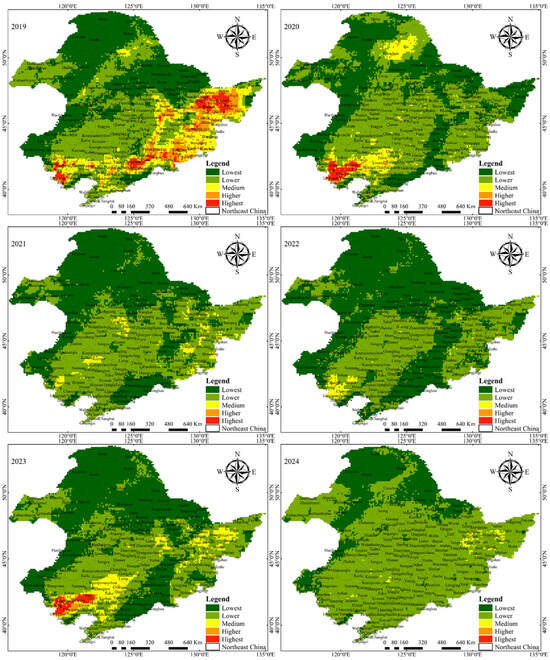 APA StyleZhao, J., Wang, M., Cai, D., Wu, L., Ji, X., Ding, Q., Wang, F., & Wang, M. (2025). Spatiotemporal Changes of Pine Caterpillar Infestation Risk and the Driving Effect of Habitat Factors in Northeast China. Remote Sensing, 17(10), 1738. https://doi.org/10.3390/rs17101738