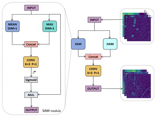 where Fmean represents the average pooling operation applied to the feature map. Fmax denotes the max pooling operation. refers to the convolution operation with a kernel size of 3 × 3, and the Sigmoid function is employed for the activation operation. Through these steps, the SAM effectively extracts and emphasizes critical information from the input features, thereby enhancing the model’s ability to perceive the targets.